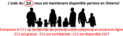 Si vous avez besoin d'aide pour trouver les services qui vous conviennent, veuillez visiter www.211ontario.ca pour un répertoire de plus de 56 000 agences et services en Ontario. Notre site Web convivial se prête à une recherche exhaustive, est mis à jour fréquemment et est disponible en deux versions, l'anglaise et la française.